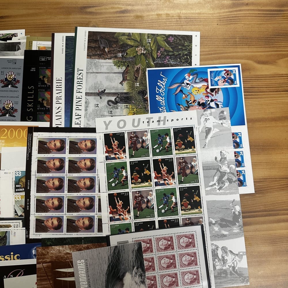 Stamp value denominations are all below the current First-Class rate, and may be self-adhesive or moisture activated, unless otherwise noted in the product title or description below.