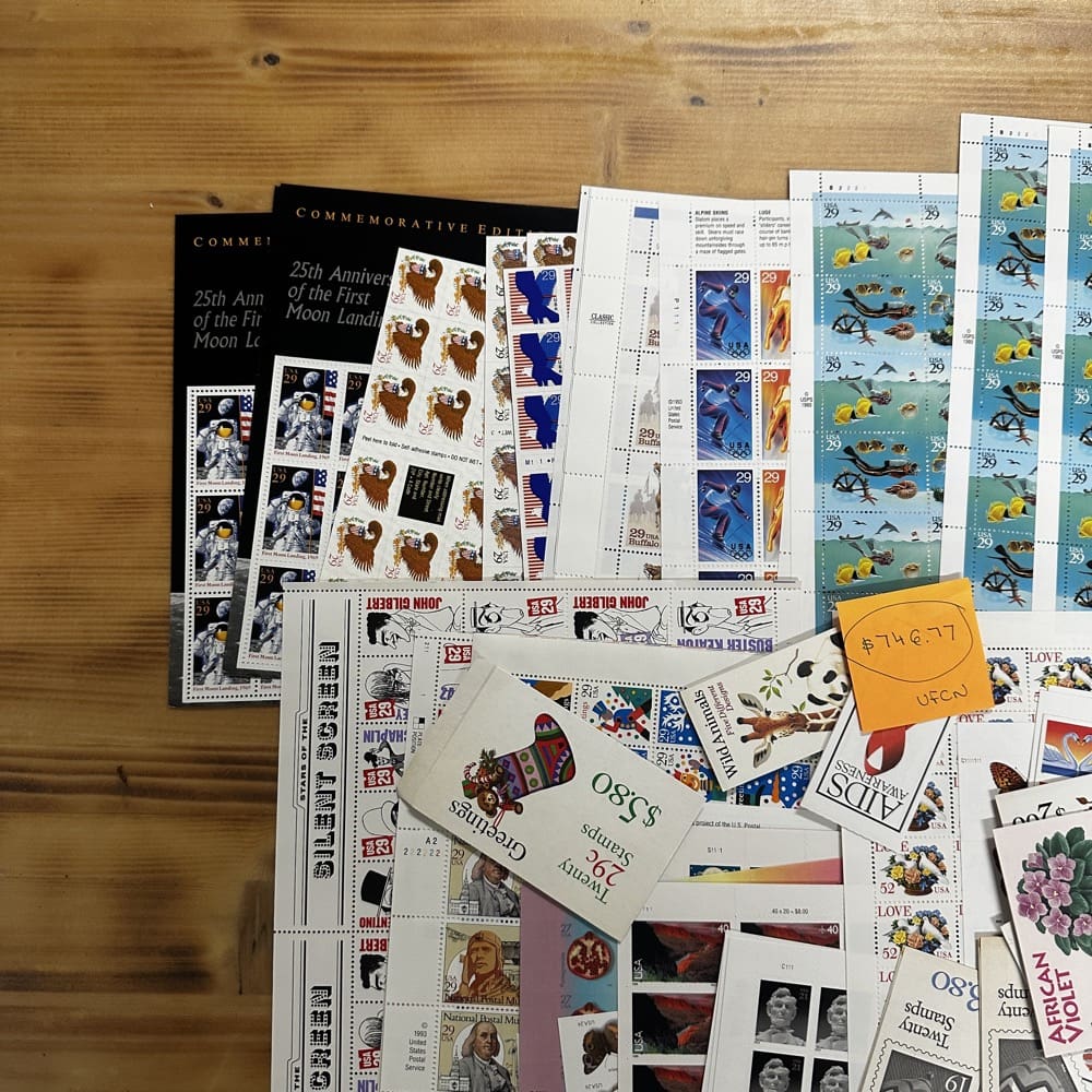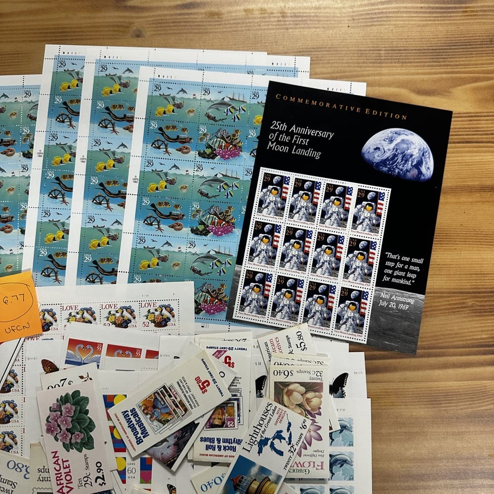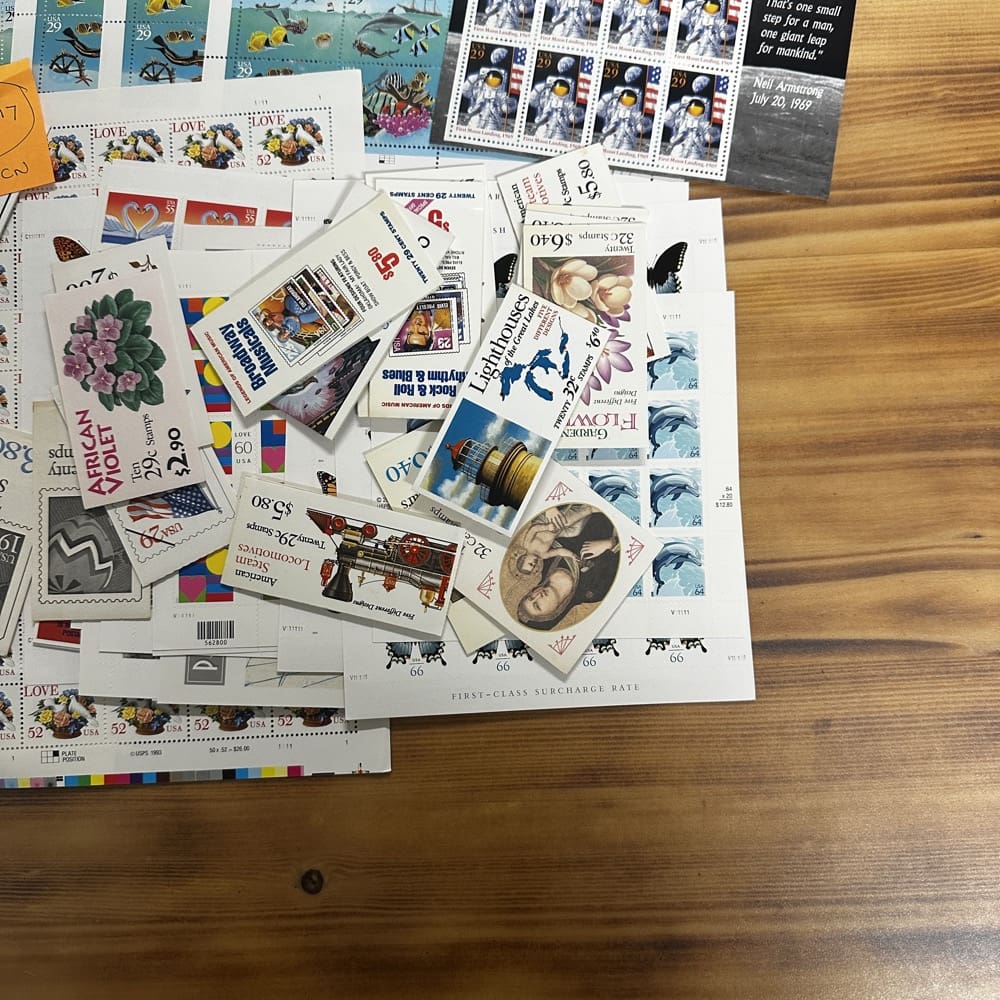 Stamp value denominations are all below the current First-Class rate, and may be self-adhesive or moisture activated, unless otherwise noted in the product title or description below.