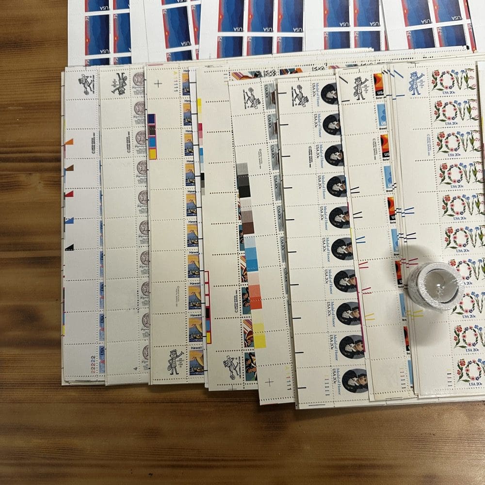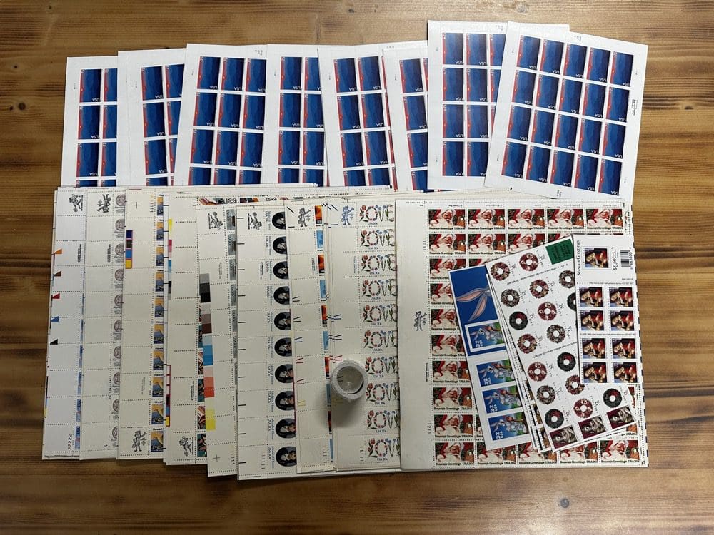 Stamp value denominations are all below the current First-Class rate, and may be self-adhesive or moisture activated, unless otherwise noted in the product title or description below.