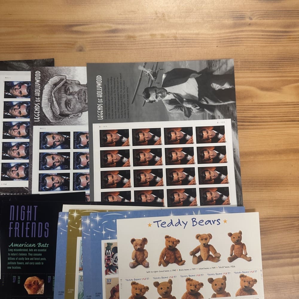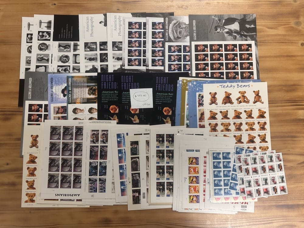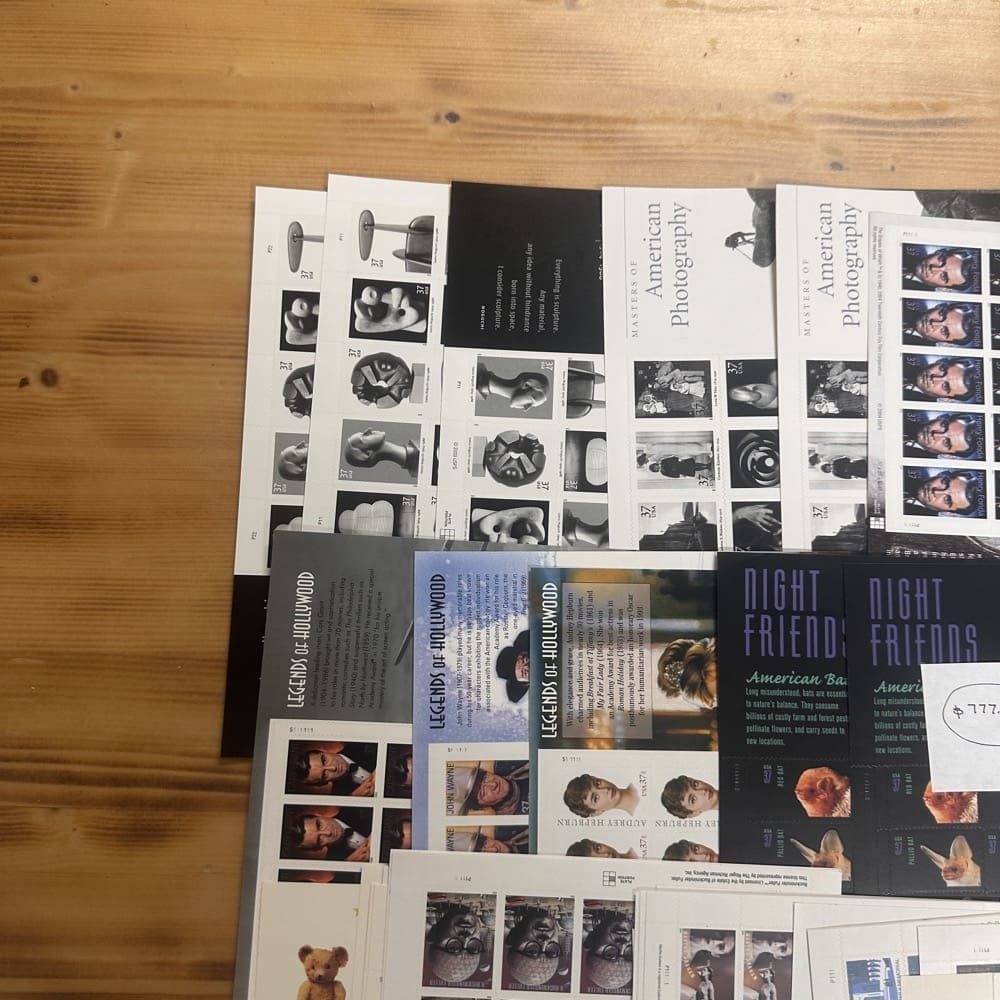 Stamp value denominations are all below the current First-Class rate, and may be self-adhesive or moisture activated, unless otherwise noted in the product title or description below.