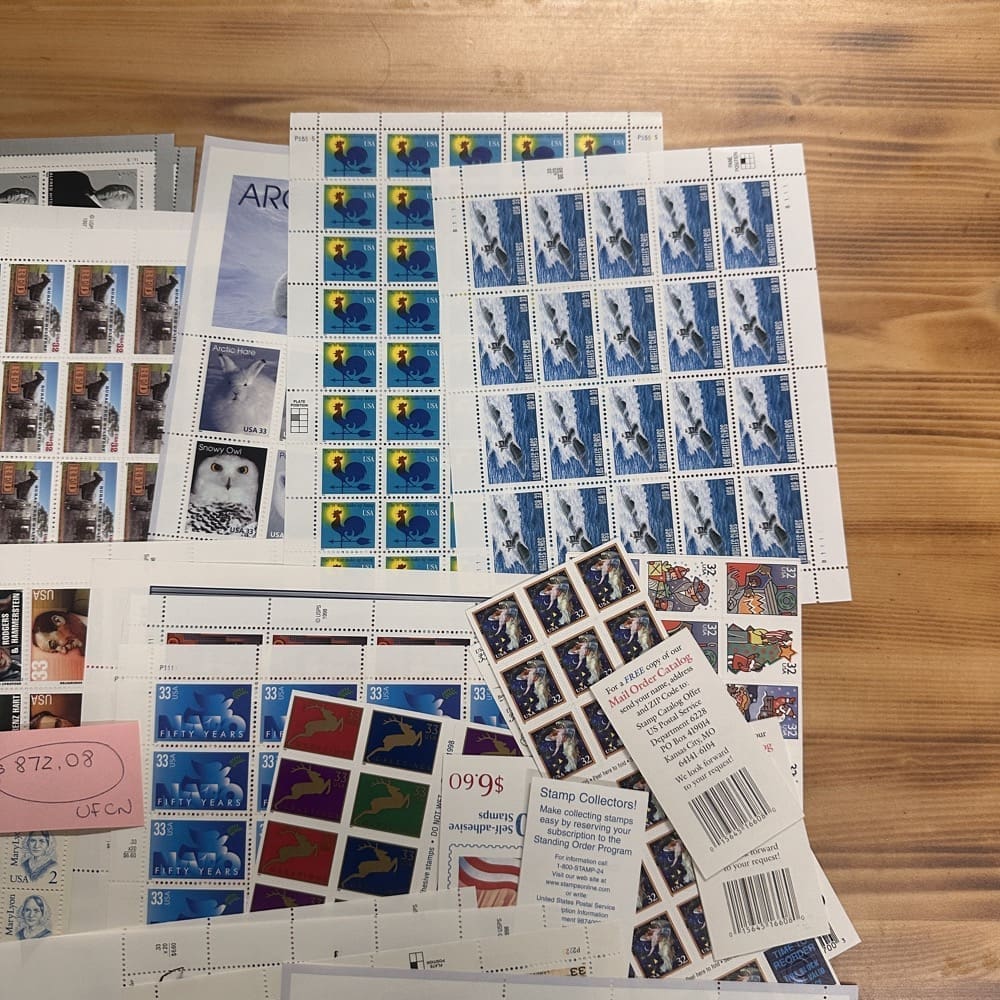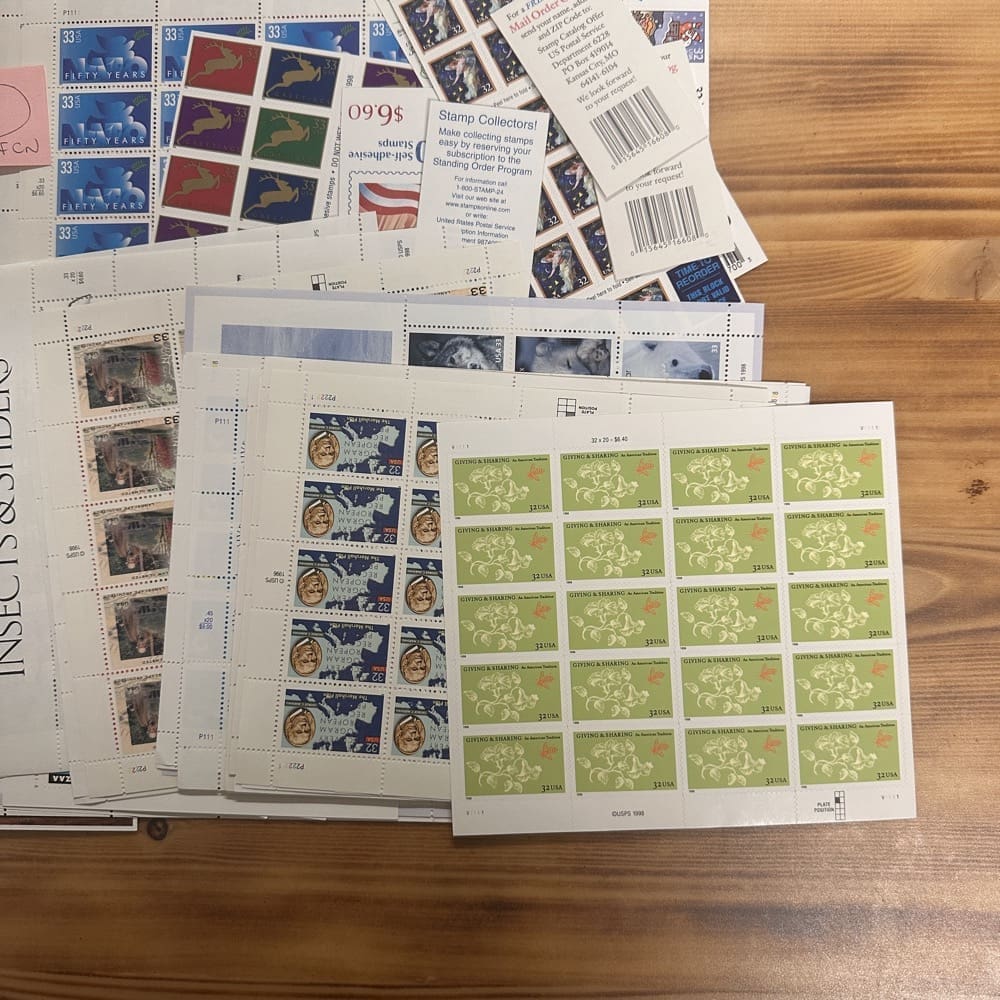 Stamp value denominations are all below the current First-Class rate, and may be self-adhesive or moisture activated, unless otherwise noted in the product title or description below.