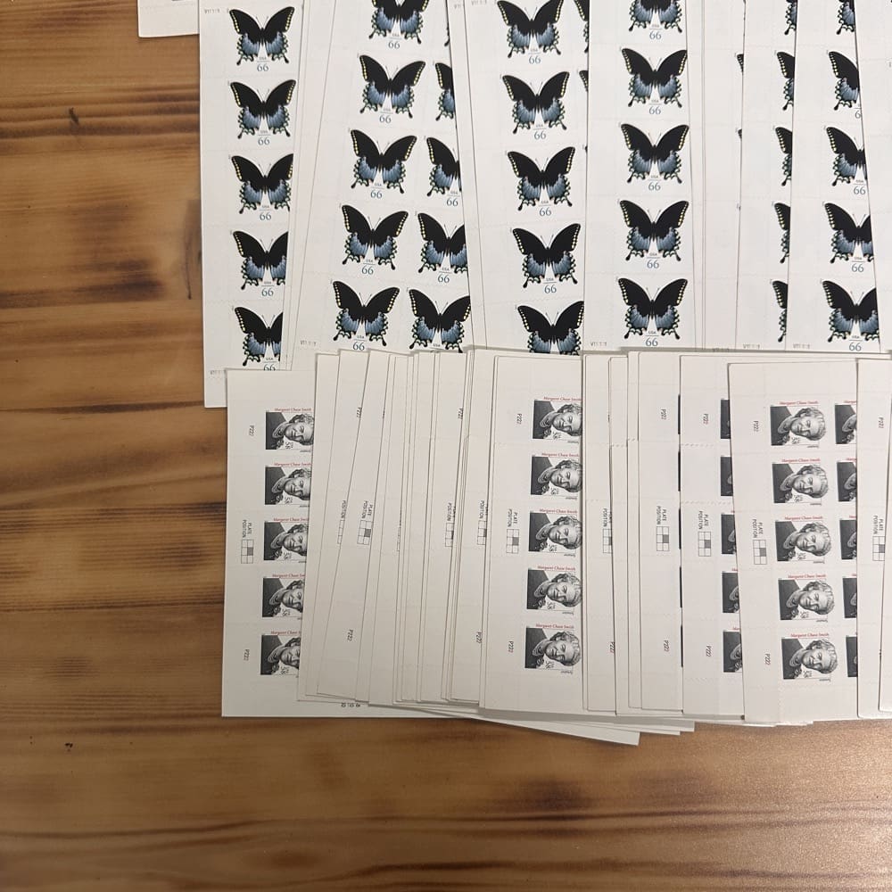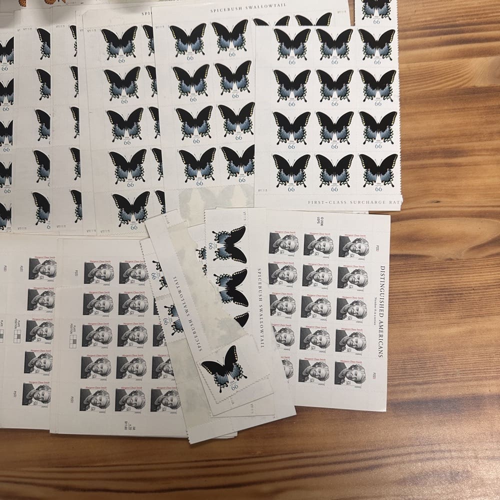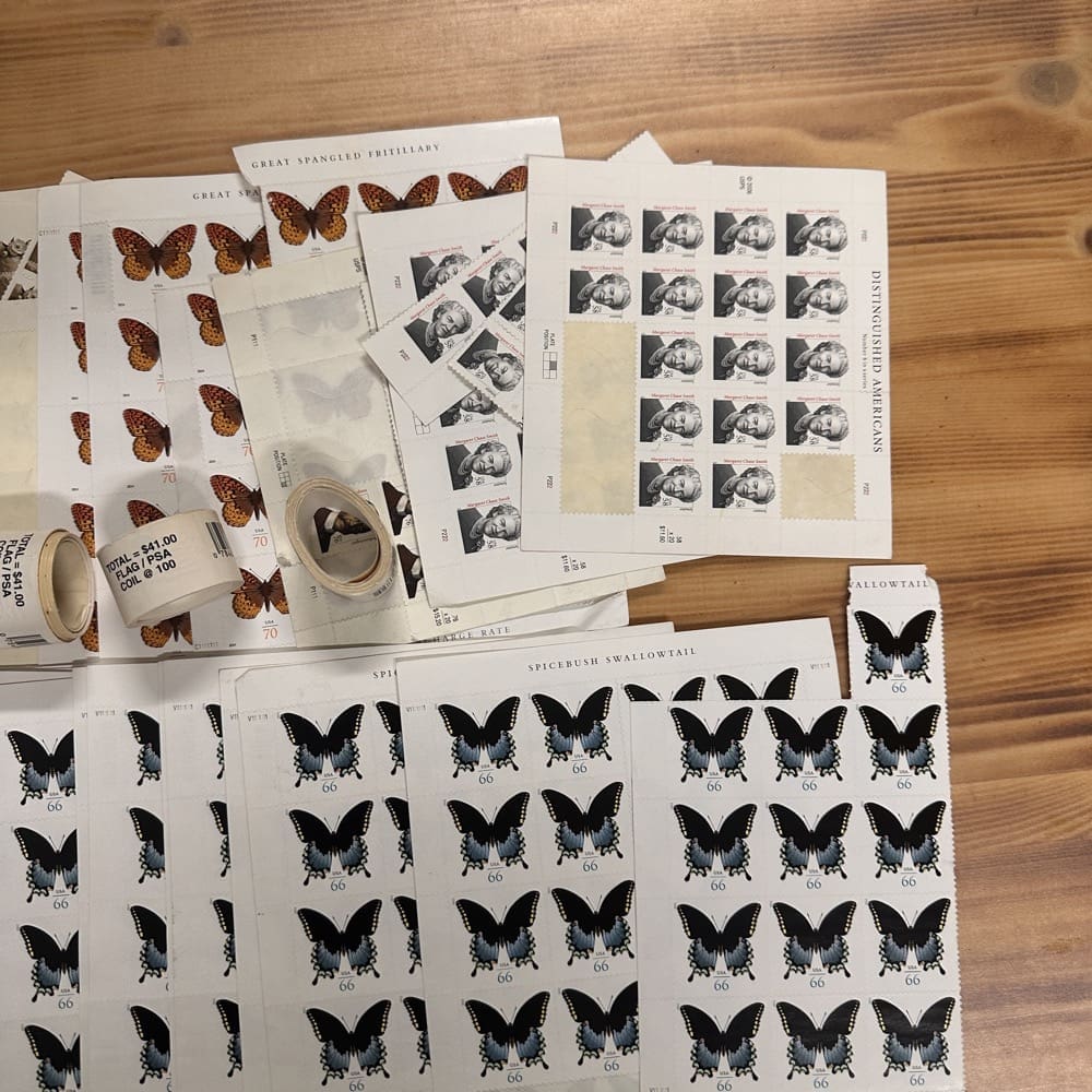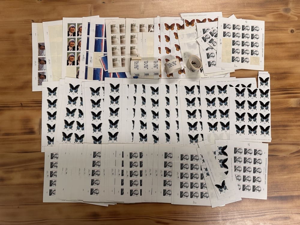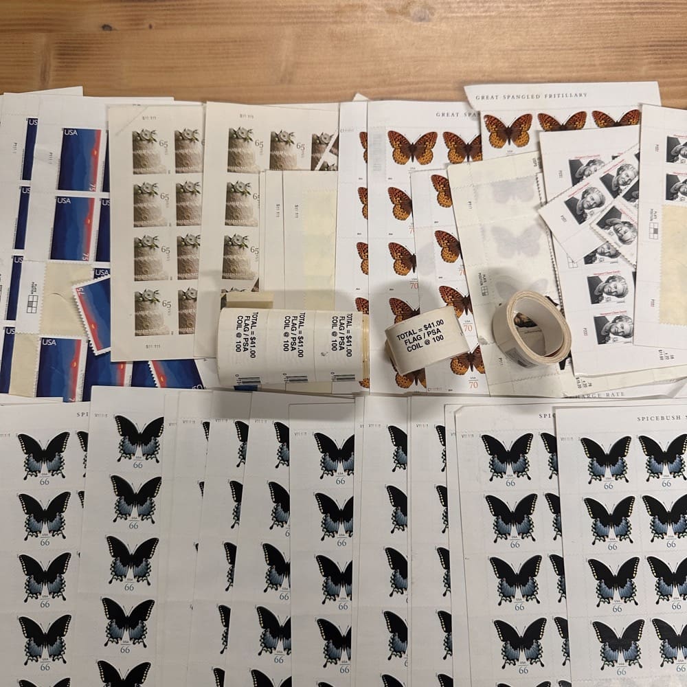 Stamp value denominations are all below the current First-Class rate, and may be self-adhesive or moisture activated, unless otherwise noted in the product title or description below.