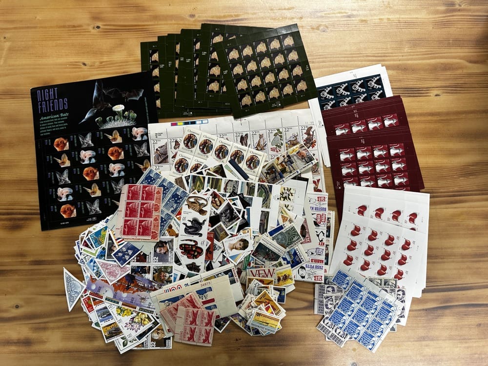 Lot of low-denomination postage stamps with values under the current First-Class rate.