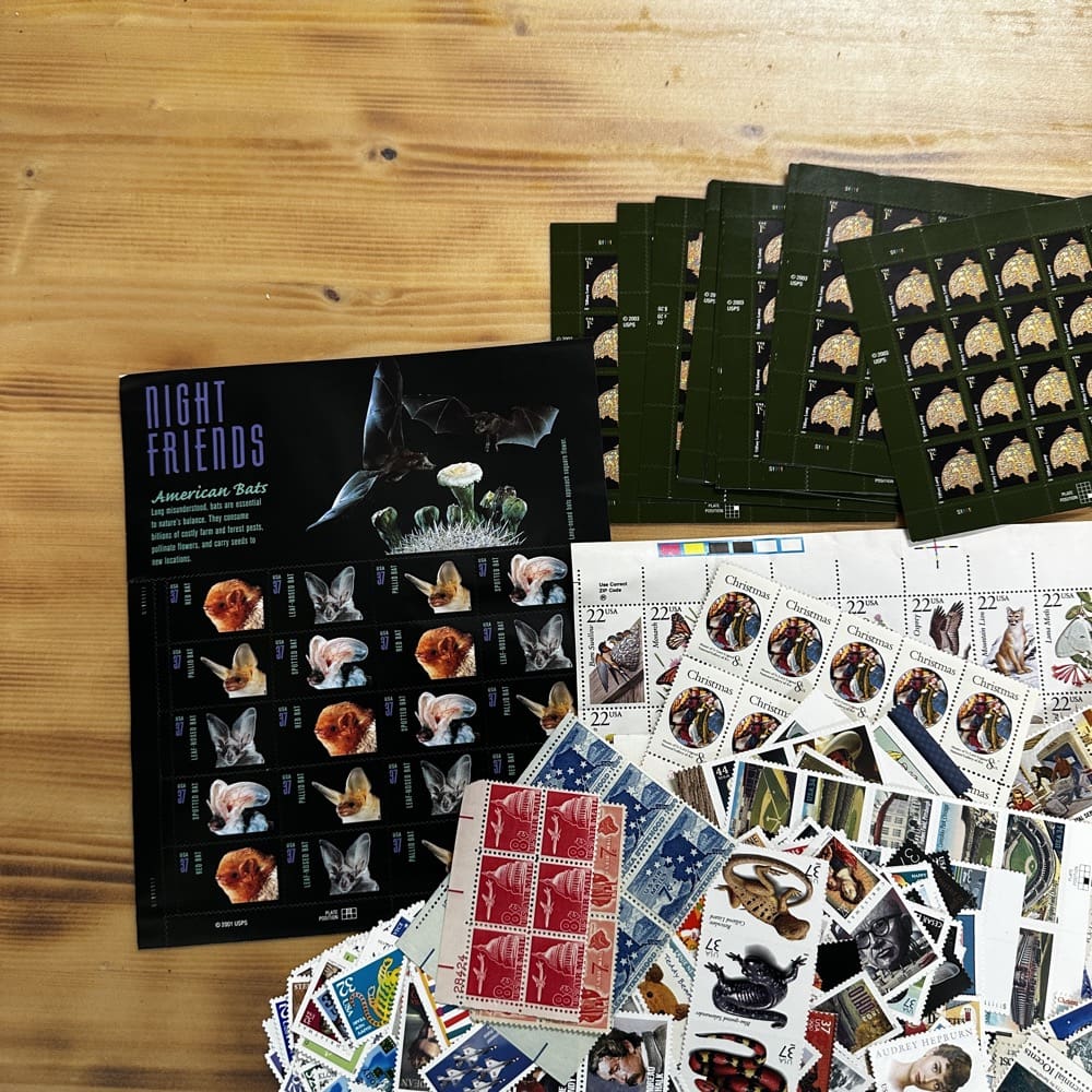U.S. postage never expires. Save money by using low-denomination postage on your mailings. Just make the shipping rate with multiple stamps. You can use them on First-Class, Priority, Express, tracking, even on insurance!