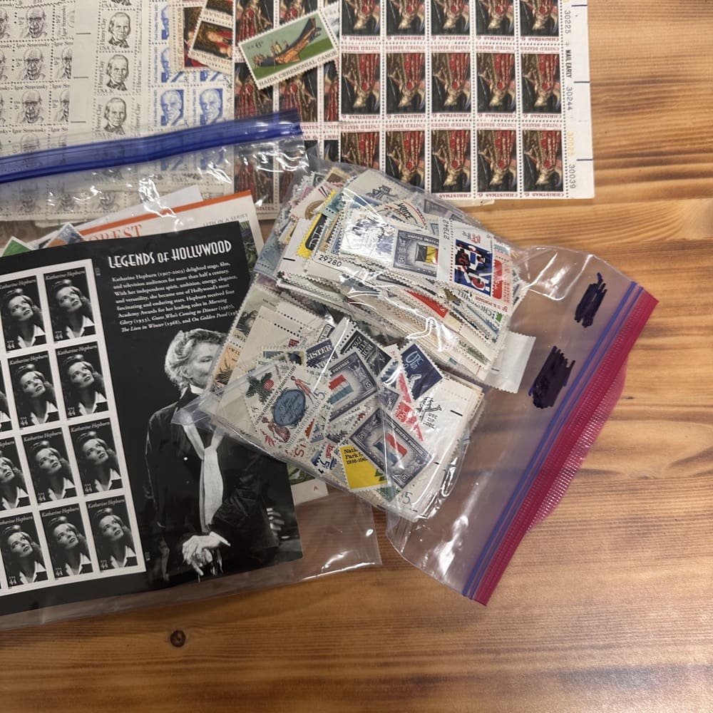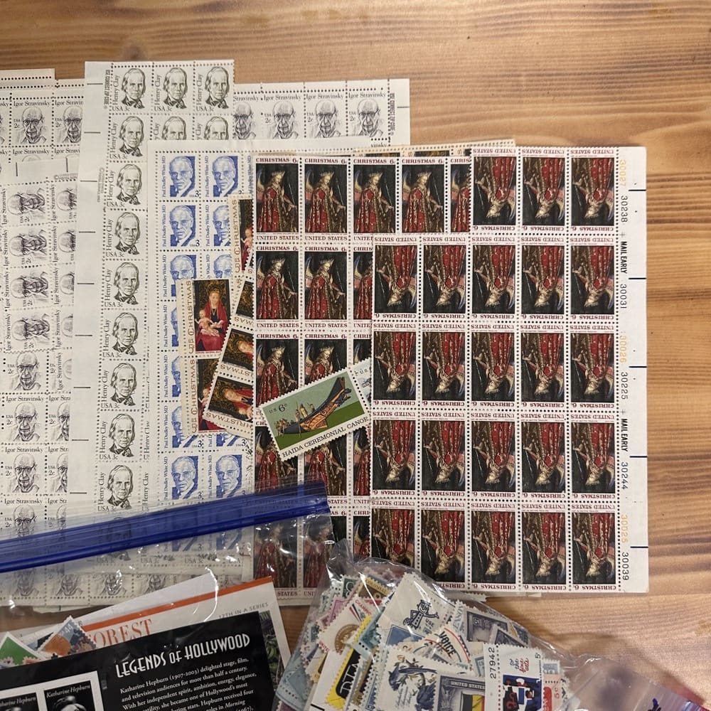 Lot of low-denomination postage stamps with values under the current First-Class rate.