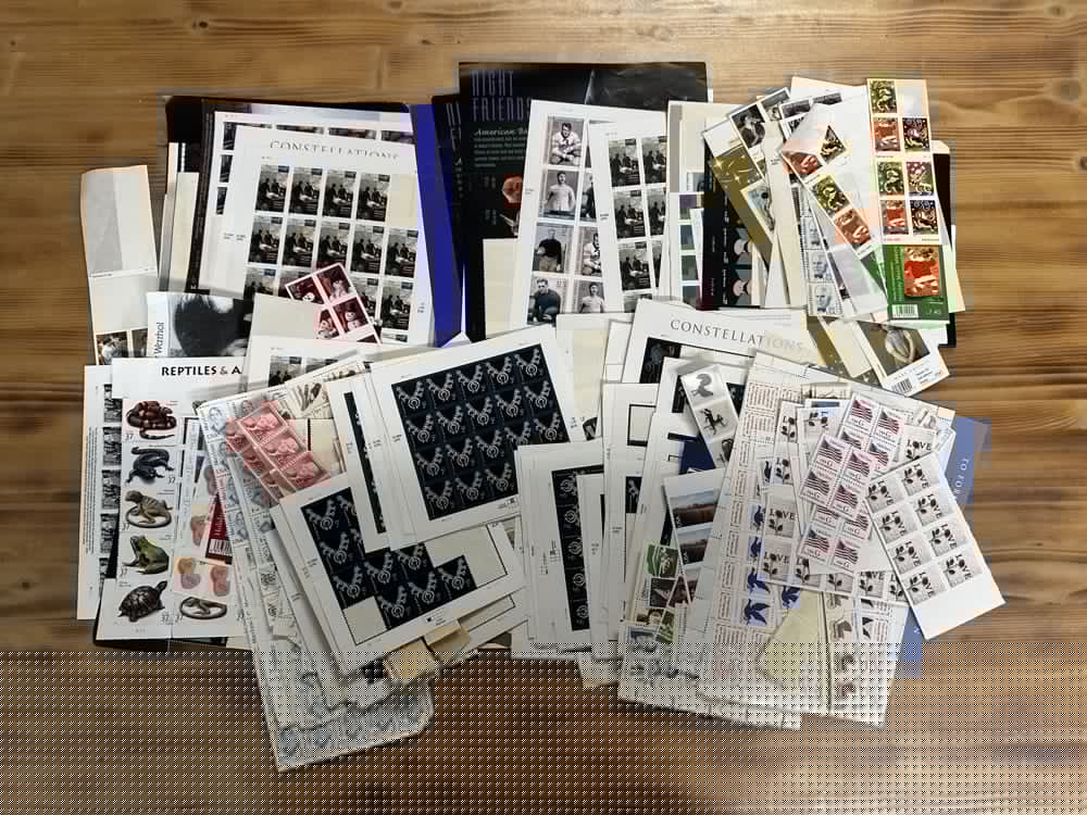 Stamp value denominations are all below the current First-Class rate, and may be self-adhesive or moisture activated, unless otherwise noted in the product title or description below.