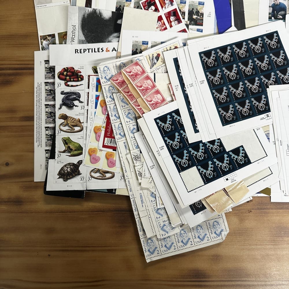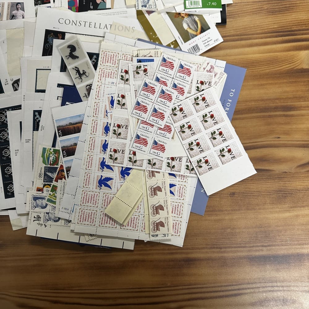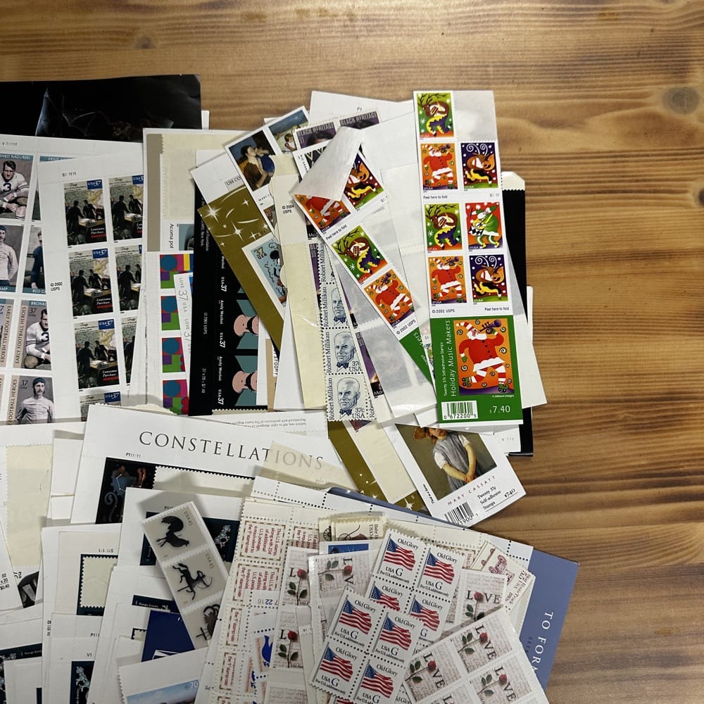 Lot of low-denomination postage stamps with values under the current First-Class rate.