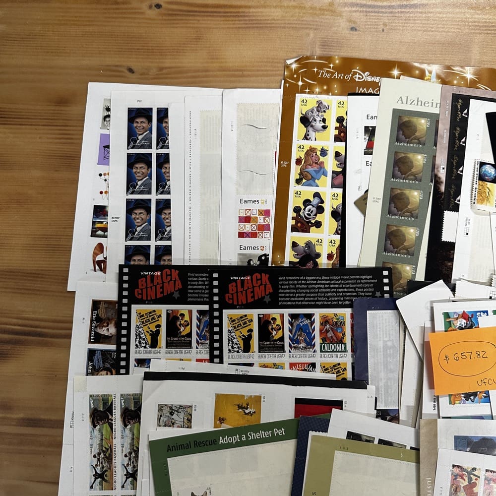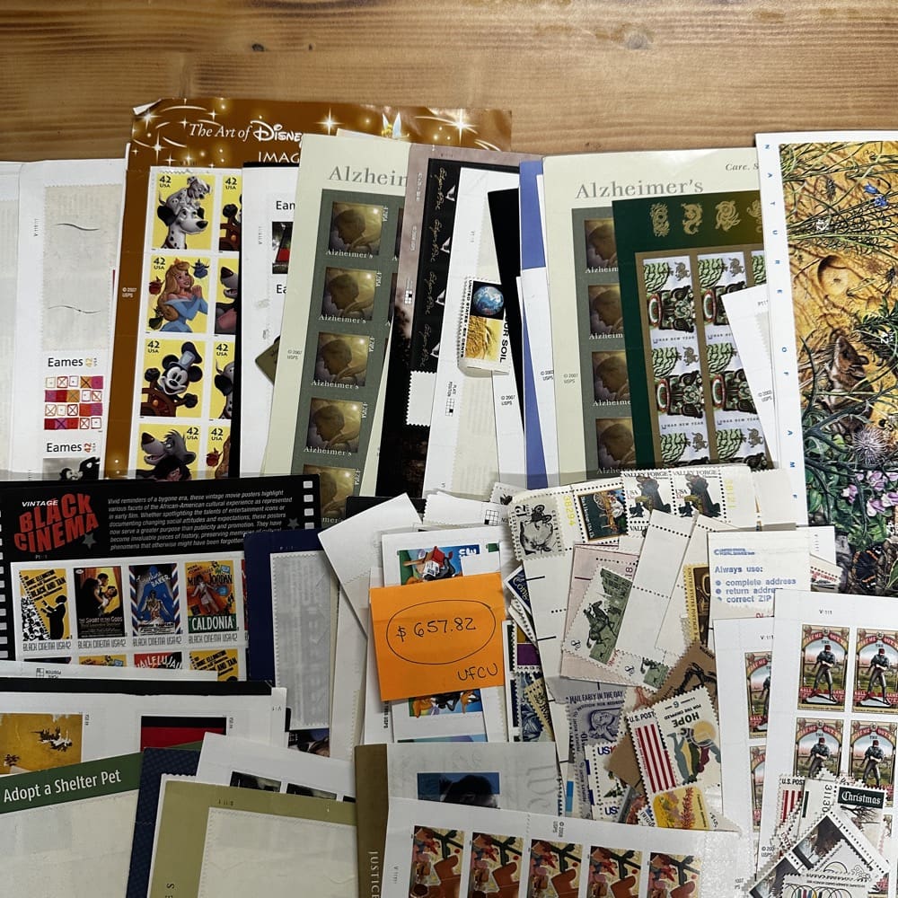 Lot of low-denomination postage stamps with values under the current First-Class rate.