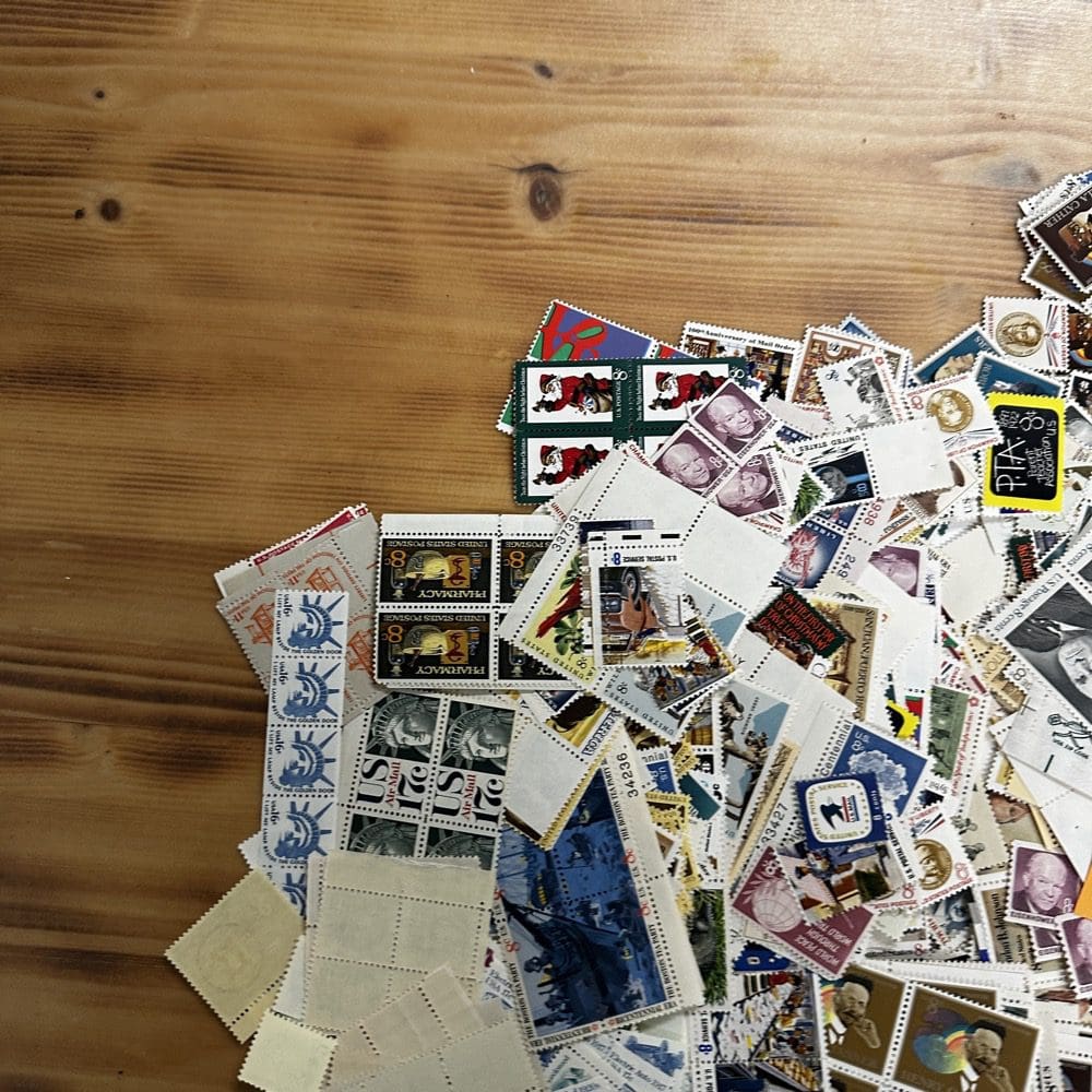Lot of low-denomination postage stamps with values under the current First-Class rate.